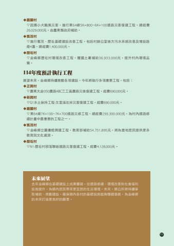 11%u25c6%u5609%u862d%u6751%u25bd%u56e0%u61c9%u5c0f%u72ac%u98b1%u98a8%u707d%u5bb3%uff0c%u9032%u884c%u677164%u7dda5K+800~6K+100%u9053%u8def%u707d%u5bb3%u5fa9%u5efa%u5de5%u7a0b%uff0c%u7e3d%u7d93%u8cbb26,029,000%u5143%uff0c%u7531%u81fa%u6771%u7e23%u653f%u5e9c%u88dc%u52a9%u3002%u25c6%u8cd3%u8302%u6751%u25bd%u9032%u884c%u8cd3%u8302%u3001%u6b77%u5775%u57fa%u790e%u5efa%u8a2d%u6539%u5584%u5de5%u7a0b%uff0c%u5305%u62ec%u6751%u8fa6%u516c%u5ba4%u5f8c%u65b9%u6c61%u6c34%u7cfb%u7d71%u6539%u5584%u53ca%u589e%u8a2d%u8def%u71c84%u76de%uff0c%u7e3d%u7d93%u8cbb1,400,000%u5143%u3002%u25c6%u6b77%u5775%u6751%u25bd%u91d1%u5cf0%u9109%u6b77%u5775%u6751%u74b0%u5883%u6539%u5584%u5de5%u7a0b%uff0c%u7372%u570b%u571f%u7f72%u88dc%u52a936,933,000%u5143%uff0c%u63d0%u5347%u6751%u5167%u74b0%u5883%u54c1%u8cea%u3002114%u5e74%u5ea6%u9810%u8a08%u57f7%u884c%u5de5%u7a0b%u5c55%u671b%u672a%u4f86%uff0c%u91d1%u5cf0%u9109%u6301%u7e8c%u63a8%u52d5%u5404%u9805%u5efa%u8a2d%uff0c%u4eca%u5e74%u5c07%u57f7%u884c%u591a%u9805%u91cd%u8981%u5de5%u7a0b%uff0c%u5305%u62ec%uff1a%u25c6%u6b63%u8208%u6751%u25bd%u8fb2%u6771%u592a%u91d1050%u8fb2%u8defABC%u4e09%u5de5%u5340%u8fb2%u8def%u707d%u5f8c%u5fa9%u5efa%u5de5%u7a0b%uff0c%u7d93%u8cbb690,000%u5143%u3002%u25c6%u65b0%u8208%u6751%u25bdG1%u6c34%u571f%u4fdd%u6301%u5de5%u7a0b-%u6587%u91cc%u6eaa%u5de6%u5cb8%u707d%u5bb3%u5fa9%u5efa%u5de5%u7a0b%uff0c%u7d93%u8cbb690,000%u5143%u3002%u25c6%u5609%u862d%u6751%u25bd%u677164%u7dda7K+100~7K+700%u9053%u8def%u707d%u4fee%u5de5%u7a0b%uff0c%u7e3d%u7d93%u8cbb293,300,000%u5143%uff0c%u70ba%u6751%u5167%u9053%u8def%u4fee%u7e55%u8a08%u756b%u4e2d%u6700%u91cd%u8981%u7684%u5de5%u7a0b%u4e4b%u4e00%u3002%u25c6%u8cd3%u8302%u6751%u25bd%u91d1%u5cf0%u9109%u7acb%u5716%u66f8%u9928%u8208%u5efa%u5de5%u7a0b%uff0c%u6559%u80b2%u90e8%u88dc%u52a954,751,895%u5143%uff0c%u5c07%u70ba%u7576%u5730%u5c45%u6c11%u63d0%u4f9b%u66f4%u591a%u6559%u80b2%u8207%u6587%u5316%u8cc7%u6e90%u3002%u25c6%u6b77%u5775%u6751%u25bdN1-%u6b77%u5775%u6751%u90e8%u843d%u806f%u7d61%u9053%u8def%u707d%u5bb3%u5fa9%u5efa%u5de5%u7a0b%uff0c%u7d93%u8cbb4,128,000%u5143%u3002%u672a%u4f86%u5c55%u671b%u53bb%u5e74%u91d1%u5cf0%u9109%u5728%u57fa%u790e%u5efa%u8a2d%u4e0a%u6210%u679c%u8c50%u78a9%uff0c%u5f9e%u9053%u8def%u4fee%u7e55%u3001%u74b0%u5883%u6539%u5584%u5230%u793e%u6703%u798f%u5229%u8a2d%u65bd%u63d0%u5347%uff0c%u70ba%u9109%u5167%u5c45%u6c11%u5e36%u4f86%u66f4%u5b9c%u5c45%u7684%u751f%u6d3b%u74b0%u5883%u3002%u672a%u4f86%uff0c%u9109%u516c%u6240%u5c07%u6301%u7e8c%u722d%u53d6%u88dc%u52a9%u3001%u898f%u5283%u5efa%u8a2d%uff0c%u78ba%u4fdd%u9109%u5167%u5404%u6751%u7684%u57fa%u790e%u8a2d%u65bd%u80fd%u5920%u7a69%u5065%u767c%u5c55%uff0c%u70ba%u91d1%u5cf0%u9109%u7684%u672a%u4f86%u6253%u9020%u66f4%u7f8e%u597d%u7684%u9858%u666f%u3002