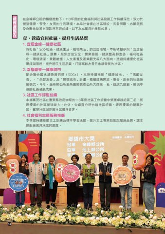 %u793e%u6703%u8ab2%u5831%u544a %u5728%u91d1%u5cf0%u9109%u516c%u6240%u7684%u7a4d%u6975%u63a8%u52d5%u4e0b%uff0c113%u5e74%u5ea6%u7684%u793e%u6703%u798f%u5229%u8207%u793e%u5340%u767c%u5c55%u5de5%u4f5c%u6301%u7e8c%u6df1%u5316%uff0c%u81f4%u529b%u65bc%u71df%u9020%u5065%u5eb7%u3001%u5b89%u5168%u3001%u53cb%u5584%u7684%u751f%u6d3b%u74b0%u5883%u3002%u672c%u5b63%u793e%u6703%u8ab2%u5728%u793e%u5340%u5efa%u8a2d%u3001%u9577%u8005%u7167%u9867%u3001%u5fd7%u9858%u670d%u52d9%u53ca%u6025%u96e3%u6551%u52a9%u7b49%u65b9%u9762%u53d6%u5f97%u4eae%u773c%u6210%u7e3e%uff0c%u4ee5%u4e0b%u70ba%u672c%u5e74%u5ea6%u7684%u91cd%u9ede%u6210%u679c%uff1a%u58f9%u3001%u71df%u9020%u5b9c%u5c45%u793e%u5340%uff0c%u63d0%u5347%u751f%u6d3b%u54c1%u8cea1. %u5b9c%u5c45%u91d1%u5cf0%u2014%u5065%u5eb7%u793e%u5340%u70ba%u6253%u9020%u300c%u5b89%u5fc3%u793e%u5340%u3001%u5065%u5eb7%u751f%u6d3b%u3001%u5728%u5730%u6a02%u6d3b%u300d%u7684%u5b9c%u5c45%u74b0%u5883%uff0c%u672c%u6240%u7a4d%u6975%u53c3%u8207%u300c%u5b9c%u5c45%u91d1%u5cf0%u2014%u5065%u5eb7%u793e%u5340%u300d%u7af6%u8cfd%uff0c%u805a%u7126%u5c45%u4f4f%u5b89%u5168%u3001%u8fb2%u696d%u767c%u5c55%u3001%u5065%u5eb7%u66a8%u9ad8%u9f61%u53cb%u5584%u3001%u798f%u5229%u793e%u5340%u5316%u3001%u74b0%u5883%u6e05%u6f54%u3001%u666f%u89c0%u7dad%u8b77%u3001%u4eba%u6587%u7d20%u990a%u53ca%u7522%u696d%u89c0%u5149%u7b49%u516b%u5927%u9762%u5411%u3002%u900f%u904e%u6301%u7e8c%u512a%u5316%u793e%u5340%u74b0%u5883%u8207%u670d%u52d9%uff0c%u63d0%u5347%u5c45%u6c11%u751f%u6d3b%u54c1%u8cea%uff0c%u6253%u9020%u9ad8%u9f61%u53cb%u5584%u4e14%u6c38%u7e8c%u767c%u5c55%u7684%u793e%u5340%u30022. %u5e78%u798f%u81fa%u6771%u2014%u5065%u5eb7%u57ce%u5e02%u914d%u5408%u806f%u5408%u570b%u6c38%u7e8c%u767c%u5c55%u76ee%u6a19%uff08SDGs%uff09%uff0c%u672c%u6240%u6301%u7e8c%u63a8%u52d5%u300c%u5065%u5eb7%u57ce%u5e02%u300d%u3001%u300c%u9ad8%u9f61%u53cb%u5584%u300d%u3001%u300c%u5931%u667a%u53cb%u5584%u300d%u53ca%u300c%u95dc%u61f7%u57ce%u5e02%u300d%u8a08%u756b%uff0c%u7a4d%u6975%u5efa%u69cb%u958b%u653e%u3001%u6574%u5408%u3001%u5275%u65b0%u7684%u793e%u5340%u767c%u5c55%u6a21%u5f0f%u3002%u4eca%u5e74%uff0c%u91d1%u5cf0%u9109%u516c%u6240%u66f4%u69ae%u7372%u9109%u93ae%u5e02%u516c%u6240%u5927%u734e%u7b2c%u4e00%u540d%uff0c%u9054%u6210%u4e5d%u9023%u9738%uff0c%u5c55%u73fe%u5353%u8d8a%u7684%u793e%u5340%u767c%u5c55%u6210%u679c%u30023. %u793e%u5340%u5de5%u4f5c%u8a55%u9451%u4f73%u7e3e%u672c%u9109%u8cd3%u8302%u793e%u5340%u5728%u81fa%u6771%u7e23%u653f%u5e9c%u8fa6%u7406%u7684113%u5e74%u5ea6%u793e%u5340%u5de5%u4f5c%u8a55%u9451%u4e2d%u69ae%u7372%u5353%u8d8a%u7d44%u7b2c%u4e8c%u540d%uff0c%u5c55%u73fe%u512a%u7570%u7684%u793e%u5340%u71df%u9020%u80fd%u529b%u3002%u6b64%u5916%uff0c%u91d1%u5cf0%u9109%u516c%u6240%u81ea%u8fa6%u793e%u5340%u8a55%u9451%uff0c%u8868%u73fe%u512a%u7570%u7684%u65b0%u8208%u793e%u5340%u3001%u8cd3%u8302%u793e%u5340%u8207%u6b63%u8208%u793e%u5340%u7372%u5f97%u80af%u5b9a%u30024. %u793e%u6703%u798f%u5229%u5fd7%u9858%u670d%u52d9%u63a8%u5ee3%u672c%u5b63%u5ea6%u6301%u7e8c%u63a8%u52d5%u5fd7%u5de5%u8a13%u7df4%u53ca%u6a19%u7aff%u5b78%u7fd2%u6d3b%u52d5%uff0c%u63d0%u5347%u5fd7%u5de5%u5c08%u696d%u6280%u80fd%u8207%u670d%u52d9%u54c1%u8cea%uff0c%u8b93%u5fd7%u9858%u670d%u52d9%u66f4%u5177%u6df1%u5ea6%u8207%u5ee3%u5ea6%u300214