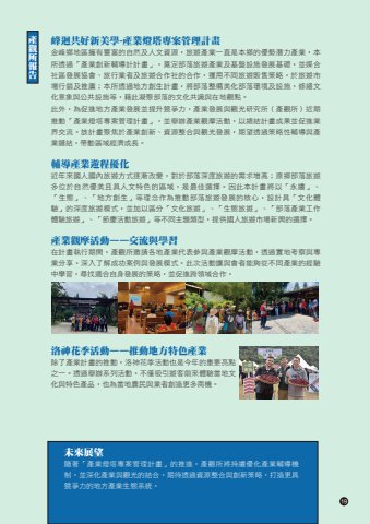 19%u7522%u89c0%u6240%u5831%u544a%u5cf0%u8ff4%u5171%u597d%u65b0%u7f8e%u5b78-%u7522%u696d%u71c8%u5854%u5c08%u6848%u7ba1%u7406%u8a08%u756b%u91d1%u5cf0%u9109%u5730%u5340%u64c1%u6709%u8c50%u5bcc%u7684%u81ea%u7136%u53ca%u4eba%u6587%u8cc7%u6e90%uff0c%u65c5%u904a%u7522%u696d%u4e00%u76f4%u662f%u672c%u9109%u7684%u512a%u52e2%u6f5b%u529b%u7522%u696d%uff0c%u672c%u6240%u900f%u904e%u300c%u7522%u696d%u5275%u65b0%u8f14%u5c0e%u8a08%u8a08%u756b%u300d%uff0c%u5960%u5b9a%u90e8%u843d%u65c5%u904a%u7522%u696d%u53ca%u57fa%u76e4%u8a2d%u65bd%u767c%u5c55%u57fa%u790e%uff0c%u4e26%u5a92%u5408%u793e%u5340%u767c%u5c55%u5354%u6703%u3001%u65c5%u884c%u696d%u8005%u53ca%u65c5%u904a%u5408%u4f5c%u793e%u7684%u5408%u4f5c%uff0c%u904b%u7528%u4e0d%u540c%u65c5%u904a%u8ca9%u552e%u7b56%u7565%uff0c%u65bc%u65c5%u904a%u5e02%u5834%u884c%u92b7%u53ca%u63a8%u5ee3%uff1b%u672c%u6240%u900f%u904e%u5730%u65b9%u5275%u751f%u8a08%u756b%uff0c%u5c07%u90e8%u843d%u6574%u5099%u7f8e%u5316%u90e8%u843d%u74b0%u5883%u53ca%u8a2d%u65bd%uff0c%u4fee%u7e55%u6587%u5316%u610f%u8c61%u8207%u516c%u5171%u8a2d%u65bd%u7b49%uff0c%u85c9%u6b64%u51dd%u805a%u90e8%u843d%u7684%u6587%u5316%u5171%u8b58%u8207%u5728%u5730%u89c0%u9ede%u3002%u6b64%u5916%uff0c%u70ba%u4fc3%u9032%u5730%u65b9%u7522%u696d%u767c%u5c55%u4e26%u63d0%u5347%u7af6%u722d%u529b%uff0c%u7522%u696d%u767c%u5c55%u8207%u89c0%u5149%u7814%u7a76%u6240%uff08%u7522%u89c0%u6240%uff09%u8fd1%u671f%u63a8%u52d5%u300c%u7522%u696d%u71c8%u5854%u5c08%u6848%u7ba1%u7406%u8a08%u756b%u300d%uff0c%u4e26%u8209%u8fa6%u7522%u696d%u89c0%u6469%u6d3b%u52d5%uff0c%u4ee5%u7e3d%u7d50%u8a08%u756b%u6210%u679c%u4e26%u4fc3%u9032%u696d%u754c%u4ea4%u6d41%u3002%u8a72%u8a08%u756b%u805a%u7126%u65bc%u7522%u696d%u5275%u65b0%u3001%u8cc7%u6e90%u6574%u5408%u8207%u89c0%u5149%u767c%u5c55%uff0c%u671f%u671b%u900f%u904e%u7b56%u7565%u6027%u8f14%u5c0e%u8207%u7522%u696d%u93c8%u7d50%uff0c%u5e36%u52d5%u5340%u57df%u7d93%u6fdf%u6210%u9577%u3002%u8f14%u5c0e%u7522%u696d%u904a%u7a0b%u512a%u5316%u8fd1%u5e74%u4f86%u570b%u4eba%u570b%u5167%u65c5%u904a%u65b9%u5f0f%u9010%u6f38%u6539%u8b8a%uff0c%u5c0d%u65bc%u90e8%u843d%u6df1%u5ea6%u65c5%u904a%u7684%u9700%u6c42%u589e%u9ad8%uff1b%u539f%u9109%u90e8%u843d%u65c5%u904a%u591a%u4f4d%u65bc%u81ea%u7136%u512a%u7f8e%u4e14%u5177%u4eba%u6587%u7279%u8272%u7684%u5340%u57df%uff0c%u662f%u6700%u4f73%u9078%u64c7%u3002%u56e0%u6b64%u672c%u8a08%u756b%u5c07%u4ee5%u300c%u6c38%u7e8c%u300d%u3001%u300c%u751f%u614b%u300d%u3001%u300c%u5730%u65b9%u5275%u751f%u300d%u7b49%u7406%u5ff5%u4f5c%u70ba%u63a8%u52d5%u90e8%u843d%u65c5%u904a%u767c%u5c55%u7684%u6838%u5fc3%uff0c%u8a2d%u8a08%u5177%u300c%u6587%u5316%u9ad4%u9a57%u300d%u7684%u6df1%u5ea6%u65c5%u904a%u6a21%u5f0f%uff0c%u4e26%u52a0%u4ee5%u5340%u5206%u300c%u6587%u5316%u65c5%u904a%u300d%u3001%u300c%u751f%u614b%u65c5%u904a%u300d%u3001%u300c%u90e8%u843d%u7522%u696d%u5de5%u4f5c%u9ad4%u9a57%u65c5%u904a%u300d%u3001%u300c%u7bc0%u6176%u6d3b%u52d5%u65c5%u904a%u300d%u7b49%u4e0d%u540c%u4e3b%u984c%u985e%u578b%uff0c%u63d0%u4f9b%u570b%u4eba%u65c5%u904a%u5e02%u5834%u65b0%u8208%u7684%u9078%u64c7%u3002%u7522%u696d%u89c0%u6469%u6d3b%u52d5%u2014%u2014%u4ea4%u6d41%u8207%u5b78%u7fd2%u5728%u8a08%u756b%u57f7%u884c%u671f%u9593%uff0c%u7522%u89c0%u6240%u9080%u8acb%u5404%u5730%u7522%u696d%u4ee3%u8868%u53c3%u8207%u7522%u696d%u89c0%u6469%u6d3b%u52d5%uff0c%u900f%u904e%u5be6%u5730%u8003%u5bdf%u8207%u5c08%u696d%u5206%u4eab%uff0c%u6df1%u5165%u4e86%u89e3%u6210%u529f%u6848%u4f8b%u8207%u767c%u5c55%u6a21%u5f0f%u3002%u6b64%u6b21%u6d3b%u52d5%u8b93%u8207%u6703%u8005%u80fd%u5920%u5f9e%u4e0d%u540c%u7522%u696d%u7684%u7d93%u9a57%u4e2d%u5b78%u7fd2%uff0c%u5c0b%u627e%u9069%u5408%u81ea%u8eab%u767c%u5c55%u7684%u7b56%u7565%uff0c%u4e26%u4fc3%u9032%u8de8%u9818%u57df%u5408%u4f5c%u3002%u6d1b%u795e%u82b1%u5b63%u6d3b%u52d5%u2014%u2014%u63a8%u52d5%u5730%u65b9%u7279%u8272%u7522%u696d%u9664%u4e86%u7522%u696d%u8a08%u756b%u7684%u63a8%u52d5%uff0c%u6d1b%u795e%u82b1%u5b63%u6d3b%u52d5%u4e5f%u662f%u4eca%u5e74%u7684%u91cd%u8981%u4eae%u9ede%u4e4b%u4e00%u3002%u900f%u904e%u8209%u8fa6%u7cfb%u5217%u6d3b%u52d5%uff0c%u4e0d%u50c5%u5438%u5f15%u904a%u5ba2%u524d%u4f86%u9ad4%u9a57%u7576%u5730%u6587%u5316%u8207%u7279%u8272%u7522%u54c1%uff0c%u4e5f%u70ba%u7576%u5730%u8fb2%u6c11%u8207%u696d%u8005%u5275%u9020%u66f4%u591a%u5546%u6a5f%u3002%u672a%u4f86%u5c55%u671b%u96a8%u8457%u300c%u7522%u696d%u71c8%u5854%u5c08%u6848%u7ba1%u7406%u8a08%u756b%u300d%u7684%u63a8%u9032%uff0c%u7522%u89c0%u6240%u5c07%u6301%u7e8c%u512a%u5316%u7522%u696d%u8f14%u5c0e%u6a5f%u5236%uff0c%u4e26%u6df1%u5316%u7522%u696d%u8207%u89c0%u5149%u7684%u7d50%u5408%uff0c%u671f%u5f85%u900f%u904e%u8cc7%u6e90%u6574%u5408%u8207%u5275%u65b0%u7b56%u7565%uff0c%u6253%u9020%u66f4%u5177%u7af6%u722d%u529b%u7684%u5730%u65b9%u7522%u696d%u751f%u614b%u7cfb%u7d71%u3002
