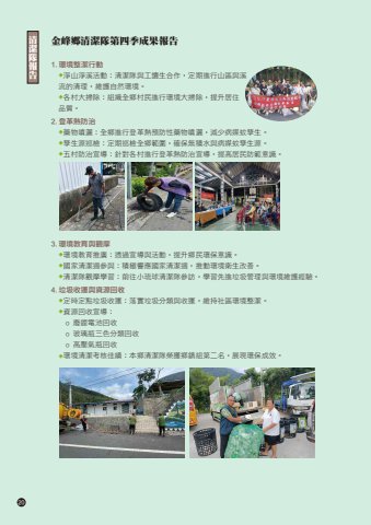 20%u6e05%u6f54%u968a%u5831%u544a%u91d1%u5cf0%u9109%u6e05%u6f54%u968a%u7b2c%u56db%u5b63%u6210%u679c%u5831%u544a1. %u74b0%u5883%u6574%u6f54%u884c%u52d5%u25c6%u6de8%u5c71%u6de8%u6eaa%u6d3b%u52d5%uff1a%u6e05%u6f54%u968a%u8207%u5de5%u8b80%u751f%u5408%u4f5c%uff0c%u5b9a%u671f%u9032%u884c%u5c71%u5340%u8207%u6eaa%u6d41%u7684%u6e05%u7406%uff0c%u7dad%u8b77%u81ea%u7136%u74b0%u5883%u3002%u25c6%u5404%u6751%u5927%u6383%u9664%uff1a%u7d44%u7e54%u5168%u9109%u6751%u6c11%u9032%u884c%u74b0%u5883%u5927%u6383%u9664%uff0c%u63d0%u5347%u5c45%u4f4f%u54c1%u8cea%u30022. %u767b%u9769%u71b1%u9632%u6cbb%u25c6%u85e5%u7269%u5674%u7051%uff1a%u5168%u9109%u9032%u884c%u767b%u9769%u71b1%u9810%u9632%u6027%u85e5%u7269%u5674%u7051%uff0c%u6e1b%u5c11%u75c5%u5a92%u868a%u5b73%u751f%u3002%u25c6%u5b73%u751f%u6e90%u5de1%u6aa2%uff1a%u5b9a%u671f%u5de1%u6aa2%u5168%u9109%u7bc4%u570d%uff0c%u78ba%u4fdd%u7121%u7a4d%u6c34%u8207%u75c5%u5a92%u868a%u5b73%u751f%u6e90%u3002%u25c6%u4e94%u6751%u9632%u6cbb%u5ba3%u5c0e%uff1a%u91dd%u5c0d%u5404%u6751%u9032%u884c%u767b%u9769%u71b1%u9632%u6cbb%u5ba3%u5c0e%uff0c%u63d0%u9ad8%u5c45%u6c11%u9632%u7bc4%u610f%u8b58%u30023. %u74b0%u5883%u6559%u80b2%u8207%u89c0%u6469%u25c6%u74b0%u5883%u6559%u80b2%u63a8%u5ee3%uff1a%u900f%u904e%u5ba3%u5c0e%u8207%u6d3b%u52d5%uff0c%u63d0%u5347%u9109%u6c11%u74b0%u4fdd%u610f%u8b58%u3002%u25c6%u570b%u5bb6%u6e05%u6f54%u9031%u53c3%u8207%uff1a%u7a4d%u6975%u97ff%u61c9%u570b%u5bb6%u6e05%u6f54%u9031%uff0c%u63a8%u52d5%u74b0%u5883%u885b%u751f%u6539%u5584%u3002%u25c6%u6e05%u6f54%u968a%u89c0%u6469%u5b78%u7fd2%uff1a%u524d%u5f80%u5c0f%u7409%u7403%u6e05%u6f54%u968a%u53c3%u8a2a%uff0c%u5b78%u7fd2%u5148%u9032%u5783%u573e%u7ba1%u7406%u8207%u74b0%u5883%u7dad%u8b77%u7d93%u9a57%u30024. %u5783%u573e%u6536%u904b%u8207%u8cc7%u6e90%u56de%u6536%u25c6%u5b9a%u6642%u5b9a%u9ede%u5783%u573e%u6536%u904b%uff1a%u843d%u5be6%u5783%u573e%u5206%u985e%u8207%u6536%u904b%uff0c%u7dad%u6301%u793e%u5340%u74b0%u5883%u6574%u6f54%u3002%u25c6%u8cc7%u6e90%u56de%u6536%u5ba3%u5c0e%uff1a o %u5ee2%u92f0%u96fb%u6c60%u56de%u6536o %u73bb%u7483%u74f6%u4e09%u8272%u5206%u985e%u56de%u6536o %u9ad8%u58d3%u6c23%u74f6%u56de%u6536%u25c6%u74b0%u5883%u6e05%u6f54%u8003%u6838%u4f73%u7e3e%uff1a%u672c%u9109%u6e05%u6f54%u968a%u69ae%u7372%u9109%u93ae%u7d44%u7b2c%u4e8c%u540d%uff0c%u5c55%u73fe%u74b0%u4fdd%u6210%u6548%u3002