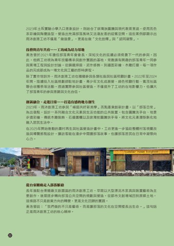 222023%u5e74%u571f%u5742%u5be6%u9a57%u5c0f%u5b78%u5165%u53e3%u610f%u8c61%u8a2d%u8a08%uff0c%u5247%u7d50%u5408%u4e86%u6392%u7063%u65cf%u5716%u9a30%u8207%u73fe%u4ee3%u6559%u80b2%u610f%u6db5%uff0c%u4f7f%u7528%u4eae%u8272%u7cfb%u5f69%u7e6a%u8207%u9676%u7515%u9020%u578b%uff0c%u71df%u9020%u51fa%u5145%u6eff%u90e8%u843d%u98a8%u5473%u53c8%u6d3b%u6f51%u53cb%u5584%u7684%u8fce%u8cd3%u7a7a%u9593%u3002%u9019%u4e9b%u6848%u4f8b%u90fd%u986f%u793a%u51fa%u96e8%u6c90%u5275%u610f%u5de5%u574a%u4e0d%u50c5%u662f%u300c%u505a%u9020%u666f%u300d%uff0c%u66f4%u662f%u5728%u505a%u300c%u6587%u5316%u8a6e%u91cb%u300d%u8207%u300c%u8a8d%u540c%u51dd%u805a%u300d%u3002%u6280%u85dd%u8207%u9752%u5e74%u5171%u80b2%u2014%u2014%u5de5%u574a%u6210%u70ba%u57f9%u529b%u57fa%u5730%u9ec3%u6d69%u66fe%u65bc2021%u5e74%u64d4%u4efb%u90e8%u843d%u9752%u5e74%u6703%u6703%u9577%uff0c%u6df1%u77e5%u6587%u5316%u7684%u5ef6%u7e8c%u5fc5%u9808%u501a%u9760%u4e0b%u4e00%u4ee3%u7684%u53c3%u8207%u3002%u56e0%u6b64%uff0c%u4ed6%u5c07%u5de5%u574a%u8996%u70ba%u9752%u5e74%u6280%u85dd%u50b3%u627f%u8207%u5275%u4f5c%u5be6%u8e10%u7684%u57fa%u5730%uff0c%u5e38%u9080%u8acb%u6709%u8208%u8da3%u7684%u90e8%u843d%u9752%u5e74%u4e00%u540c%u53c3%u8207%u6848%u5834%u5de5%u7a0b%u8207%u8a2d%u8a08%u8a0e%u8ad6%u3002%u5f9e%u92fc%u9435%u710a%u63a5%u3001%u6ce5%u4f5c%u4fee%u98fe%uff0c%u5230%u7246%u9762%u5f69%u7e6a%u3001%u6728%u96d5%u6253%u78e8%uff0c%u6bcf%u4e00%u9805%u4f5c%u54c1%u7684%u5b8c%u6210%u90fd%u6210%u70ba%u4e00%u5834%u6587%u5316%u8207%u5de5%u85dd%u7684%u5373%u6642%u8ab2%u7a0b%u3002%u9664%u4e86%u5be6%u4f5c%u57f9%u8a13%u5916%uff0c%u96e8%u6c90%u5275%u610f%u5de5%u574a%u4e5f%u7a4d%u6975%u53c3%u8207%u5404%u985e%u793e%u9020%u8207%u793e%u5340%u7167%u9867%u8a08%u756b%u30022022%u5e74%u81f32024%u5e74%u9593%uff0c%u9678%u7e8c%u6295%u5165%u793e%u5340%u898f%u5283%u5e2b%u99d0%u5730%u8a08%u756b%u3001%u9752%u5c11%u5e74%u6587%u5316%u6210%u5c55%u71df%u3001%u7da0%u8272%u7167%u9867%u884c%u52d5%u3001%u8cd3%u8302%u793e%u5340%u806f%u5408%u6536%u7a6b%u796d%u7b49%u6d3b%u52d5%u3002%u900f%u904e%u5be6%u969b%u53c3%u8207%u793e%u5340%u71df%u9020%uff0c%u4e0d%u50c5%u63d0%u5347%u4e86%u5de5%u574a%u7684%u5728%u5730%u5f71%u97ff%u529b%uff0c%u4e5f%u64f4%u5927%u4e86%u90e8%u843d%u9752%u5e74%u7684%u53c3%u8207%u610f%u9858%u8207%u6587%u5316%u81ea%u4fe1%u3002%u5275%u65b0%u878d%u5408%u3001%u8d70%u9032%u65e5%u5e38%u2014%u2014%u6253%u9020%u6709%u611f%u7684%u5730%u65b9%u5275%u751f2023%u5e74%uff0c%u96e8%u6c90%u5275%u610f%u5de5%u574a%u53c3%u8207%u300c%u5cf0%u8ff4%u5171%u597d%u65b0%u7f8e%u5b78%u300d%u4eae%u9ede%u7522%u696d%u5275%u65b0%u8a08%u756b%uff0c%u4ee5%u300c%u90e8%u843d%u65e5%u5e38%u300d%u70ba%u51fa%u767c%u9ede%uff0c%u8a2d%u8a08%u4e00%u7cfb%u5217%u878d%u5408%u6587%u5316%u5143%u7d20%u8207%u751f%u6d3b%u529f%u80fd%u7684%u516c%u5171%u88dd%u7f6e%uff0c%u5305%u542b%u5716%u9a30%u6d17%u624b%u53f0%u3001%u5730%u666f%u6b65%u9053%u5f69%u7e6a%u3001%u50b3%u7d71%u6728%u96d5%u88dd%u98fe%u3001%u77f3%u7246%u570d%u6b04%u4ee5%u53ca%u6392%u7063%u86c7%u5716%u9a30%u6276%u624b%u7b49%uff0c%u5c07%u6587%u5316%u5143%u7d20%u6f5b%u79fb%u9ed8%u5316%u5730%u878d%u5165%u5c45%u6c11%u751f%u6d3b%u4e2d%u3002%u57282025%u5e74%u958b%u59cb%u63a8%u52d5%u7684%u8fb2%u6751%u518d%u751f%u8207%u793e%u5340%u71df%u9020%u8a08%u756b%u4e2d%uff0c%u5de5%u574a%u66f4%u9032%u4e00%u6b65%u5354%u52a9%u6574%u9ad4%u6751%u843d%u8996%u89ba%u6539%u9020%u8207%u5c0e%u89bd%u7bc0%u9ede%u8a2d%u8a08%uff0c%u8b93%u8a2a%u5ba2%u80fd%u5728%u6f2b%u6b65%u4e2d%u95b1%u8b80%u90e8%u843d%u6545%u4e8b%uff0c%u4e5f%u8b93%u90e8%u843d%u5c45%u6c11%u5728%u65e5%u5e38%u4e2d%u51dd%u805a%u5411%u5fc3%u529b%u3002%u5f9e%u53f0%u6771%u7cd6%u5ee0%u8d70%u5165%u90e8%u843d%u8108%u7d61%u9577%u5e74%u9032%u99d0%u53f0%u6771%u7cd6%u5ee0%u6587%u5275%u5712%u5340%u7684%u96e8%u6c90%u5275%u610f%u5de5%u574a%uff0c%u65e9%u671f%u4ee5%u5927%u578b%u6f02%u6d41%u6728%u5bb6%u5177%u8207%u88dd%u7f6e%u85dd%u8853%u70ba%u4e3b%u8981%u5275%u4f5c%uff0c%u5f8c%u671f%u9010%u6b65%u8f49%u5411%u90e8%u843d%u516c%u5171%u7a7a%u9593%u7684%u898f%u5283%u8207%u71df%u9020%u3002%u5f9e%u90fd%u5e02%u6587%u5275%u5834%u57df%u56de%u5230%u539f%u9109%u571f%u5730%uff0c%u9019%u689d%u8def%u4e0d%u53ea%u662f%u5275%u696d%u65b9%u5411%u7684%u8f49%u8b8a%uff0c%u66f4%u662f%u6587%u5316%u56de%u6b78%u7684%u5be6%u8e10%u3002%u9ec3%u6d69%u66fe%u8aaa%uff1a%u300c%u6211%u5011%u505a%u7684%u4e0d%u53ea%u662f%u85dd%u8853%uff0c%u800c%u662f%u8b93%u90e8%u843d%u7684%u6587%u5316%u5728%u7a7a%u9593%u88e1%u9577%u51fa%u751f%u547d%u3002%u300d%u9019%u53e5%u8a71%u6b63%u662f%u96e8%u6c90%u5275%u610f%u5de5%u574a%u7684%u6838%u5fc3%u7cbe%u795e%u3002