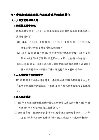 %u4e03%u3001%u512a%u5316%u884c%u653f%u670d%u52d9%u6548%u80fd-%u884c%u653f%u670d%u52d9%u6548%u7387%u7cbe%u9032%u8207%u512a%u5316%uff08%u4e00%uff09%u843d%u5be6%u8cc7%u6e90%u50be%u807d%u6c11%u80721. %u8fa6%u7406%u6751%u91cc%u806f%u7e6b%u6703%u5831:%u9080%u96c6%u5404%u8ab2%u5ba4%u4e3b%u7ba1%u3001%u6751%u9577%u3001%u6751%u5e79%u4e8b%u53ca%u9130%u9577%u5171%u540c%u5c0d%u65bc%u672a%u4f86%u6751%u91cc%u4e8b%u52d9%u9032%u884c%u5171%u8b58%u6703%u8b70%u5982%u4e0b%uff1a(1) 114%u5e74 1%u6708 13%u65e5%u30011%u6708 14%u65e5%u30011%u6708 15%u65e5%u30011%u6708 20%u65e5%u30011%u6708 21%u65e5%u5404%u8ab2%u5ba4%u4e3b%u7ba1%u4e0b%u9109%u81f3%u5404%u6751%u53ec%u958b%u9109%u653f%u8aaa%u660e%u6703%u3002(2) 113 %u5e74 12%u6708 18%u65e5%u53ec%u958b 113 %u5e74%u5ea6%u7b2c%u516d%u6b21%u6751%u52d9%u5de5%u4f5c%u6703%u5831%u3001114%u5e74 2 %u670824%u65e5%u30014%u6708 29%u65e5%u53ec%u958b114%u5e74%u5ea6%u7b2c%u4e00%u6b21%u3001%u7b2c%u4e8c%u6b21%u6751%u52d9%u5de5%u4f5c%u6703%u8b70%u3002(3) 113%u5e7411%u6708%u81f3114%u5e744%u6708%u5404%u6751%u516c%u5171%u8a2d%u65bd%u7dad%u4fee%u901a%u5831%u55ae%u6848%u4ef6%uff1a%u5609%u862d%u67515%u4ef6%u3001%u6b63%u8208%u67516%u4ef6%u3001%u65b0%u8208%u67517%u4ef6%u3001%u8cd3%u8302%u6751 5%u4ef6%u3001%u6b77%u5775%u6751 7%u4ef6%u30022. %u4eba%u6c11%u9673%u8acb%u6848%u4ef6%u53ca%u8a34%u9858%u6848%u4ef6113%u5e74 11%u6708%u81f3 114%u5e74 4%u6708%u9673%u60c5%u81f3%u300c%u81fa%u6771%u7e23%u653f%u5e9c 1999%u70ba%u6c11%u670d%u52d9%u4e2d%u5fc3%u300d%u53ca%u300c%u672c%u6240%u5b98%u7db2%u9673%u60c5%u8207%u5efa%u8b70%u7cfb%u7d71%u300d%uff0c%u5171%u8a08 2 %u6848%uff0c%u7686%u5df1%u7d50%u6848%u4e14%u4f9d%u9650%u59a5%u8655%u9673%u60c5%u4eba%u30023. %u70ba%u6c11%u670d%u52d9%u696d%u52d9(1) 113%u5e74 6%u6708%u8d77%u8058%u8acb%u8449%u4ef2%u539f%u5f8b%u5e2b%u64d4%u4efb%u672c%u9109%u514d%u8cbb%u6cd5%u5f8b%u8aee%u8a62%u5f8b%u5e2b%uff0c113%u5e74 11%u6708%u81f3114%u5e74 4%u6708%u5404%u6751%u8aee%u8a62%u4eba%u6578%u8a0825%u4eba%u3002(2)%u8abf%u89e3%u59d4%u54e1%u6703%uff1a%u5354%u52a9%u8abf%u89e3%u6c11%u4e8b%u4e8b%u4ef6%u4ee5%u53ca%u544a%u8a34%u4e43%u8ad6%u7684%u5211%u4e8b%u4e8b%u4ef6%uff0c113 %u5e7411%u6708%u81f3114%u5e744%u6708%u8abf%u89e3%u6848%u4ef6%u8a087%u4ef6%u3002(%u6210%u7acb%u4ef6%u6578:5%u3001%u4e0d%u6210%u7acb%u4ef6%u6578:2)%u30029