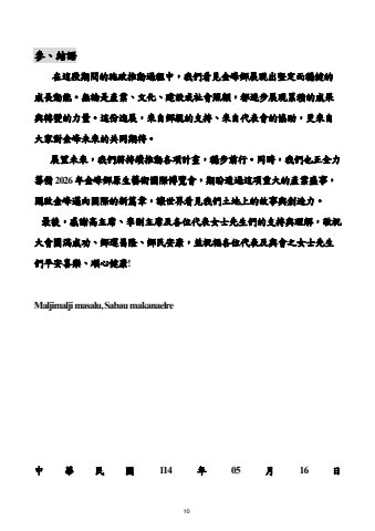 %u53c3%u3001%u7d50%u8a9e %u5728%u9019%u6bb5%u671f%u9593%u7684%u65bd%u653f%u63a8%u52d5%u904e%u7a0b%u4e2d%uff0c%u6211%u5011%u770b%u898b%u91d1%u5cf0%u9109%u5c55%u73fe%u51fa%u5805%u5b9a%u800c%u7a69%u5065%u7684%u6210%u9577%u52d5%u80fd%u3002%u7121%u8ad6%u662f%u7522%u696d%u3001%u6587%u5316%u3001%u5efa%u8a2d%u6216%u793e%u6703%u7167%u9867%uff0c%u90fd%u9010%u6b65%u5c55%u73fe%u7d2f%u7a4d%u7684%u6210%u679c%u8207%u8f49%u8b8a%u7684%u529b%u91cf%u3002%u9019%u4efd%u9032%u5c55%uff0c%u4f86%u81ea%u9109%u89aa%u7684%u652f%u6301%u3001%u4f86%u81ea%u4ee3%u8868%u6703%u7684%u5354%u52a9%uff0c%u66f4%u4f86%u81ea%u5927%u5bb6%u5c0d%u91d1%u5cf0%u672a%u4f86%u7684%u5171%u540c%u671f%u5f85%u3002 %u5c55%u671b%u672a%u4f86%uff0c%u6211%u5011%u5c07%u6301%u7e8c%u63a8%u52d5%u5404%u9805%u8a08%u756b%uff0c%u7a69%u6b65%u524d%u884c%u3002%u540c%u6642%uff0c%u6211%u5011%u4e5f%u6b63%u5168%u529b%u7c4c%u5099 2026%u5e74%u91d1%u5cf0%u9109%u539f%u751f%u85dd%u8853%u570b%u969b%u535a%u89bd%u6703%uff0c%u671f%u76fc%u900f%u904e%u9019%u9805%u91cd%u5927%u7684%u7522%u696d%u76db%u4e8b%uff0c%u958b%u555f%u91d1%u5cf0%u9081%u5411%u570b%u969b%u7684%u65b0%u7bc7%u7ae0%uff0c%u8b93%u4e16%u754c%u770b%u898b%u6211%u5011%u571f%u5730%u4e0a%u7684%u6545%u4e8b%u8207%u5275%u9020%u529b%u3002 %u6700%u5f8c%uff0c%u611f%u8b1d%u9ad8%u4e3b%u5e2d%u3001%u674e%u526f%u4e3b%u5e2d%u53ca%u5404%u4f4d%u4ee3%u8868%u5973%u58eb%u5148%u751f%u5011%u7684%u652f%u6301%u8207%u7406%u89e3%uff0c%u656c%u795d%u5927%u6703%u5713%u6eff%u6210%u529f%u3001%u9109%u904b%u660c%u9686%u3001%u9109%u6c11%u5b89%u5eb7%uff0c%u4e26%u795d%u798f%u5404%u4f4d%u4ee3%u8868%u53ca%u8207%u6703%u4e4b%u5973%u58eb%u5148%u751f%u5011%u5e73%u5b89%u559c%u6a02%u3001%u9806%u5fc3%u5065%u5eb7! Maljimalji masalu, Sabau makanaelre%u4e2d %u83ef %u6c11 %u570b 114 %u5e74 05 %u6708 16 %u65e510