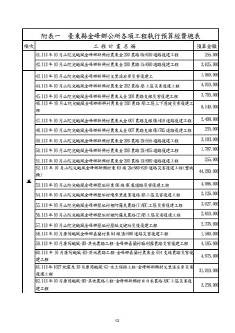 %u9644%u8868%u4e00 %u81fa%u6771%u7e23%u91d1%u5cf0%u9109%u516c%u6240%u5404%u9805%u5de5%u7a0b%u57f7%u884c%u9810%u7b97%u7d93%u8cbb%u7e3d%u8868%u9805%u6b21 %u5de5 %u7a0b %u8a08 %u756b %u540d %u7a31 %u9810%u7b97%u91d1%u984d41.113%u5e7410%u6708%u5c71%u9640%u5152%u98b1%u98a8%u91d1%u5cf0%u9109%u65b0%u8208%u6751%u8fb2%u6771%u91d1200%u8fb2%u8def0k+930%u9053%u8def%u5fa9%u5efa%u5de5%u7a0b 255,00042.113%u5e7410%u6708%u5c71%u9640%u5152%u98b1%u98a8%u91d1%u5cf0%u9109%u65b0%u8208%u6751%u8fb2%u6771%u91d1200%u8fb2%u8def1k+080%u9053%u8def%u5fa9%u5efa%u5de5%u7a0b 3,625,000%u4e09 43.113%u5e7410%u6708%u5c71%u9640%u5152%u98b1%u98a8%u91d1%u5cf0%u9109%u65b0%u8208%u6751%u6587%u91cc%u6eaa%u53f3%u5cb8%u707d%u5bb3%u5fa9%u5efa%u5de5 1,960,00044.113%u5e7410%u6708%u5c71%u9640%u5152%u98b1%u98a8%u91d1%u5cf0%u9109%u65b0%u8208%u6751%u8fb2%u6771%u91d1202%u8fb2%u8defAB%u5de5%u5340%u707d%u5bb3%u5fa9%u5efa%u5de5%u7a0b 4,910,00045.113%u5e7410%u6708%u5c71%u9640%u5152%u98b1%u98a8%u91d1%u5cf0%u9109%u65b0%u8208%u6751%u8fb2%u6771%u592a%u91d1200%u8fb2%u8def%u652f%u7dda%u707d%u5bb3%u5fa9%u5efa%u5de5%u7a0b 3,795,00046.113%u5e7410%u6708%u5c71%u9640%u5152%u98b1%u98a8%u91d1%u5cf0%u9109%u65b0%u8208%u6751%u8fb2%u6771%u91d1203%u8fb2%u8defAB%u5de5%u5340%u4e0a%u4e0b%u908a%u5761%u707d%u5bb3%u5fa9%u5efa%u5de5%u7a0b8,140,00047.113%u5e7410%u6708%u5c71%u9640%u5152%u98b1%u98a8%u91d1%u5cf0%u9109%u65b0%u8208%u6751%u8fb2%u6771%u592a%u91d1007%u8fb2%u8def%u652f%u7dda0K+410%u9053%u8def%u5fa9%u5efa%u5de5%u7a0b 2,498,00048.113%u5e7410%u6708%u5c71%u9640%u5152%u98b1%u98a8%u91d1%u5cf0%u9109%u65b0%u8208%u6751%u8fb2%u6771%u592a%u91d1007%u8fb2%u8def%u652f%u7dda0K+785%u9053%u8def%u5fa9%u5efa%u5de5%u7a0b 255,00049.113%u5e7410%u6708%u5c71%u9640%u5152%u98b1%u98a8%u91d1%u5cf0%u9109%u65b0%u8208%u6751%u8fb2%u6771%u91d1200%u8fb2%u8def2K+555%u9053%u8def%u5fa9%u5efa%u5de5%u7a0b 3,183,00050.113%u5e7410%u6708%u5c71%u9640%u5152%u98b1%u98a8%u91d1%u5cf0%u9109%u65b0%u8208%u6751%u8fb2%u6771%u91d1200%u8fb2%u8def2K+405%u9053%u8def%u5fa9%u5efa%u5de5%u7a0b 1,787,00051.113%u5e7410%u6708%u5c71%u9640%u5152%u98b1%u98a8%u91d1%u5cf0%u9109%u65b0%u8208%u6751%u8fb2%u6771%u91d1200%u8fb2%u8def1K+980%u9053%u8def%u5fa9%u5efa%u5de5%u7a0b 255,00052.113 %u5e74 10 %u6708%u5c71%u9640%u5152%u98b1%u98a8%u91d1%u5cf0%u9109%u65b0%u8208%u6751%u6771 63 %u7dda 2k+580-620 %u9053%u8def%u707d%u5bb3%u5fa9%u5efa%u5de5%u7a0b(%u8c50%u6536%u6a4b)44,280,00053.113%u5e7410%u6708%u5c71%u9640%u5152%u98b1%u98a8%u91d1%u5cf0%u9109%u6b77%u5775%u6751%u677166%u7dda4K%u8655%u9053%u8def%u707d%u5bb3%u5fa9%u5efa%u5de5%u7a0b 4,986,00054.113%u5e7410%u6708%u5c71%u9640%u5152%u98b1%u98a8%u91d1%u5cf0%u9109%u6b77%u5775%u6751%u560e%u4f86%u91cc%u7522%u696d%u9053%u8defAB%u5de5%u5340%u707d%u5bb3%u5fa9%u5efa%u5de5%u7a0b 3,126,00055.113%u5e7410%u6708%u5c71%u9640%u5152%u98b1%u98a8%u91d1%u5cf0%u9109%u6b77%u5775%u6751%u88e1%u963f%u85a9%u514b%u8fb2%u8def(1)ABC%u5de5%u5340%u707d%u5bb3%u5fa9%u5efa%u5de5%u7a0b 3,027,00056.113%u5e7410%u6708%u5c71%u9640%u5152%u98b1%u98a8%u91d1%u5cf0%u9109%u6b77%u5775%u6751%u88e1%u963f%u85a9%u514b%u8fb2%u8def(2)AB%u5de5%u5340%u707d%u5bb3%u5fa9%u5efa%u5de5%u7a0b 2,810,00057.113%u5e7410%u6708%u5c71%u9640%u5152%u98b1%u98a8%u91d1%u5cf0%u9109%u6b77%u5775%u6751%u6b77%u5775%u6587%u5065%u7ad9%u707d%u5f8c%u5fa9%u5efa%u5de5%u7a0b 2,376,00058.113%u5e7410%u6708%u5eb7%u82ae%u98b1%u98a8%u91d1%u5cf0%u9109%u5609%u862d%u6751%u677164%u7dda2K+900%u9053%u8def%u707d%u5bb3%u5fa9%u5efa%u5de5%u7a0b 1,580,00059.113%u5e7410%u6708%u5eb7%u82ae%u98b1%u98a8-H3-%u5176%u4ed6%u8fb2%u8def%u5de5%u7a0b-%u91d1%u5cf0%u9109%u5609%u862d%u6751%u9ebb%u5229%u9727%u8fb2%u8def%u707d%u5bb3%u5fa9%u5efa%u5de5%u7a0b 4,185,00060.113 %u5e74 10 %u6708%u5eb7%u82ae%u98b1%u98a8-H3-%u5176%u4ed6%u8fb2%u8def%u5de5%u7a0b-%u91d1%u5cf0%u9109%u5609%u862d%u6751%u8fb2%u6771%u91d1 014 %u652f%u7dda%u8fb2%u8def%u707d%u5bb3%u5fa9%u5efa%u5de5%u7a0b4,975,00061.113%u5e741027%u5730%u9707%u53ca10%u6708%u5eb7%u82ae%u98b1%u98a8-G1-%u6c34%u571f%u4fdd%u6301%u5de5%u7a0b-%u91d1%u5cf0%u9109%u65b0%u8208%u6751%u6587%u91cc%u6eaa%u5de6%u5cb8%u707d%u5bb3%u5fa9%u5efa%u5de5%u7a0b31,910,00062.113%u5e7410%u6708%u5eb7%u82ae%u98b1%u98a8-H3-%u5176%u4ed6%u8fb2%u8def%u5de5%u7a0b-%u91d1%u5cf0%u9109%u65b0%u8208%u6751%u76ee%u65e5%u672c%u8fb2%u8defABC%u5de5%u5340%u707d%u5bb3%u5fa9%u5efa%u5de5%u7a0b3,258,00013