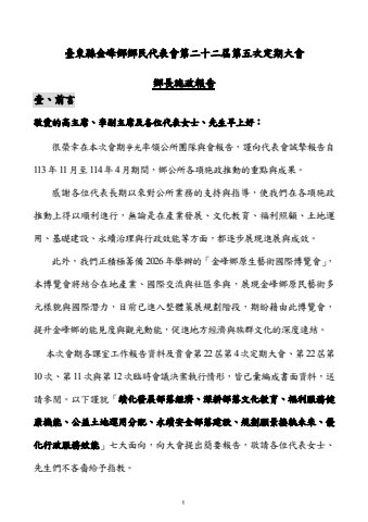 %u81fa%u6771%u7e23%u91d1%u5cf0%u9109%u9109%u6c11%u4ee3%u8868%u6703%u7b2c%u4e8c%u5341%u4e8c%u5c46%u7b2c%u4e94%u6b21%u5b9a%u671f%u5927%u6703%u9109%u9577%u65bd%u653f%u5831%u544a%u58f9%u3001%u524d%u8a00%u656c%u611b%u7684%u9ad8%u4e3b%u5e2d%u3001%u674e%u526f%u4e3b%u5e2d%u53ca%u5404%u4f4d%u4ee3%u8868%u5973%u58eb%u3001%u5148%u751f%u65e9%u4e0a%u597d%uff1a%u5f88%u69ae%u5e78%u5728%u672c%u6b21%u6703%u671f%u722d%u5149%u7387%u9818%u516c%u6240%u5718%u968a%u8207%u6703%u5831%u544a%uff0c%u8b39%u5411%u4ee3%u8868%u6703%u8aa0%u646f%u5831%u544a%u81ea113%u5e7411%u6708%u81f3114%u5e74 4%u6708%u671f%u9593%uff0c%u9109%u516c%u6240%u5404%u9805%u65bd%u653f%u63a8%u52d5%u7684%u91cd%u9ede%u8207%u6210%u679c%u3002%u611f%u8b1d%u5404%u4f4d%u4ee3%u8868%u9577%u671f%u4ee5%u4f86%u5c0d%u516c%u6240%u696d%u52d9%u7684%u652f%u6301%u8207%u6307%u5c0e%uff0c%u4f7f%u6211%u5011%u5728%u5404%u9805%u65bd%u653f%u63a8%u52d5%u4e0a%u5f97%u4ee5%u9806%u5229%u9032%u884c%uff0c%u7121%u8ad6%u662f%u5728%u7522%u696d%u767c%u5c55%u3001%u6587%u5316%u6559%u80b2%u3001%u798f%u5229%u7167%u9867%u3001%u571f%u5730%u904b%u7528%u3001%u57fa%u790e%u5efa%u8a2d%u3001%u6c38%u7e8c%u6cbb%u7406%u8207%u884c%u653f%u6548%u80fd%u7b49%u65b9%u9762%uff0c%u90fd%u9010%u6b65%u5c55%u73fe%u9032%u5c55%u8207%u6210%u6548%u3002%u6b64%u5916%uff0c%u6211%u5011%u6b63%u7a4d%u6975%u7c4c%u5099 2026%u5e74%u8209%u8fa6%u7684%u300c%u91d1%u5cf0%u9109%u539f%u751f%u85dd%u8853%u570b%u969b%u535a%u89bd%u6703%u300d%uff0c%u672c%u535a%u89bd%u6703%u5c07%u7d50%u5408%u5728%u5730%u7522%u696d%u3001%u570b%u969b%u4ea4%u6d41%u8207%u793e%u5340%u53c3%u8207%uff0c%u5c55%u73fe%u91d1%u5cf0%u9109%u539f%u6c11%u85dd%u8853%u591a%u5143%u6a23%u8c8c%u8207%u570b%u969b%u6f5b%u529b%uff0c%u76ee%u524d%u5df2%u9032%u5165%u6574%u9ad4%u7b56%u5c55%u898f%u5283%u968e%u6bb5%uff0c%u671f%u76fc%u85c9%u7531%u6b64%u535a%u89bd%u6703%uff0c%u63d0%u5347%u91d1%u5cf0%u9109%u7684%u80fd%u898b%u5ea6%u8207%u89c0%u5149%u52d5%u80fd%uff0c%u4fc3%u9032%u5730%u65b9%u7d93%u6fdf%u8207%u65cf%u7fa4%u6587%u5316%u7684%u6df1%u5ea6%u9023%u7d50%u3002 %u672c%u6b21%u6703%u671f%u5404%u8ab2%u5ba4%u5de5%u4f5c%u5831%u544a%u8cc7%u6599%u53ca%u8cb4%u6703%u7b2c22%u5c46%u7b2c4%u6b21%u5b9a%u671f%u5927%u6703%u3001%u7b2c22%u5c46%u7b2c10%u6b21%u3001%u7b2c11%u6b21%u8207%u7b2c12%u6b21%u81e8%u6642%u6703%u8b70%u6c7a%u6848%u57f7%u884c%u60c5%u5f62%uff0c%u7686%u5df2%u5f59%u7de8%u6210%u66f8%u9762%u8cc7%u6599%uff0c%u9001%u8acb%u53c3%u95b1%u3002%u4ee5%u4e0b%u8b39%u5c31%u300c%u7e3e%u5316%u767c%u5c55%u90e8%u843d%u7d93%u6fdf%u3001%u6df1%u8015%u90e8%u843d%u6587%u5316%u6559%u80b2%u3001%u798f%u5229%u670d%u52d9%u5065%u5eb7%u6a5f%u80fd%u3001%u516c%u76ca%u571f%u5730%u904b%u7528%u5206%u914d%u3001%u6c38%u7e8c%u5b89%u5168%u90e8%u843d%u5efa%u8a2d%u3001%u898f%u5283%u9858%u666f%u63a5%u8ecc%u672a%u4f86%u3001%u512a%u5316%u884c%u653f%u670d%u52d9%u6548%u80fd%u300d%u4e03%u5927%u9762%u5411%uff0c%u5411%u5927%u6703%u63d0%u51fa%u7c21%u8981%u5831%u544a%uff0c%u656c%u8acb%u5404%u4f4d%u4ee3%u8868%u5973%u58eb%u3001%u5148%u751f%u5011%u4e0d%u541d%u55c7%u7d66%u4e88%u6307%u6559%u30021