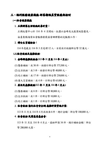 %u4e09%u3001%u798f%u5229%u670d%u52d9%u5065%u5eb7%u6a5f%u80fd-%u90e8%u843d%u885b%u798f%u771f%u5be6%u670d%u52d9%u8207%u6aa2%u8a0e(%u4e00)%u793e%u6703%u5065%u5eb7%u6a5f%u80fd1. %u6b63%u8208%u90e8%u843d%u751f%u6d3b%u8a2d%u65bd%u6539%u5584%u8a08%u756b%uff1a%u6b63%u8208%u6258%u5b30%u4e2d%u5fc3%u65bc 114 %u5e74 4 %u6708%u958b%u7ad9%uff0c%u6258%u5b30%u4ee5%u91d1%u5cf0%u53ca%u592a%u9ebb%u91cc%u5730%u5340%u512a%u5148%uff0c%u7531%u81fa%u6771%u7e23%u6d77%u68e0%u793e%u6703%u670d%u52d9%u767c%u5c55%u5354%u6703%u8fa6%u7406%u5b30%u5e7c%u5152%u670d%u52d9%u5de5%u4f5c%u30022. %u5a66%u5973%u751f%u80b2%u88dc%u52a9%u91d1%uff1a 114%u5e74%u5ea6%u622a%u81f3114%u5e743%u6708%u53d7%u740612%u4eba%uff0c%u76ee%u524d%u5171%u8a08%u6838%u64a5%u65b0%u53f0%u5e63 32%u842c%u5143%u3002(%u4e8c)%u793e%u6703%u6551%u52a9%u53ca%u6025%u96e3%u6551%u52a9:1. %u91d1%u5cf0%u9109%u6025%u96e3%u6276%u52a9%u91d1(113%u5e74 11%u6708%u81f3114%u5e744%u6708%u6b62):(1) %u91ab%u7642%u88dc%u52a9%uff1a%u5171 30%u4ef6%uff0c%u6838%u767c%u8a08%u65b0%u53f0%u5e63 373,300%u5143%u3002(2) %u751f%u6d3b%u6276%u52a9%uff1a%u51713%u4ef6%uff0c%u6838%u767c%u8a08%u65b0%u53f0%u5e6340,000%u5143%u3002(3) %u6b7b%u4ea1%u88dc%u52a9%uff1a%u5171 17%u4ef6%uff0c%u6838%u767c%u8a08%u65b0%u53f0%u5e63 230,000%u5143%u3002(4) %u91cd%u5927%u707d%u5bb3%u88dc%u52a9%uff1a%u5171 4%u4ef6%uff0c%u8a08%u65b0%u53f0%u5e6365,000%u5143%u30022. %u539f%u4f4f%u6c11%u6025%u96e3%u6551%u52a9(113%u5e74 11%u6708%u81f3 114%u5e744%u6708%u6b62):(1) %u91ab%u7642%u88dc%u52a9%uff1a%u5171 8%u4ef6%uff0c%u8a08%u65b0%u53f0%u5e6380,800%u5143%u3002(2) %u751f%u6d3b%u6276%u52a9%uff1a%u51711%u4ef6%uff0c%u8a08%u65b0%u53f0%u5e6310,000%u5143%u3002(3) %u6b7b%u4ea1%u88dc%u52a9%uff1a%u51711%u4ef6%uff0c%u8a08%u65b0%u53f0%u5e6310,000%u5143%u30023. %u793e%u6703%u6551%u52a9-%u5f37%u5316%u793e%u6703%u5b89%u5168%u7db2-%u6025%u96e3%u7d13%u56f0%u5be6%u65bd%u65b9%u6848:113%u5e7411%u6708%u81f3114%u5e744%u6708%u5171%u6838%u51c66%u4ef6%uff0c%u7e3d%u8a08%u91d1%u984d%uff1a%u65b0%u53f0%u5e63180,000%u5143%u30024. %u793e%u6703%u6551%u52a9-%u6c11%u9593%u6148%u5584%u57fa%u91d1%u6703:113 %u5e74 11 %u6708%u81f3 114 %u5e74 4 %u6708%u6b62%uff0c%u5354%u52a9%u7533%u8acb 34 %u4ef6%uff0c%u7e3d%u8a08%u88dc%u52a9%u91d1%u984d%uff1a%u65b0%u53f0%u5e63280,000%u5143%u6574%u30024