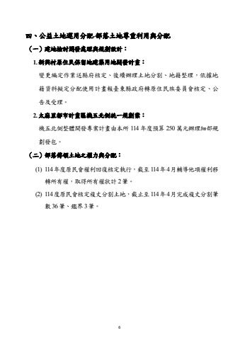 %u56db%u3001%u516c%u76ca%u571f%u5730%u904b%u7528%u5206%u914d-%u90e8%u843d%u571f%u5730%u5c0a%u91cd%u5229%u7528%u8207%u5206%u914d%uff08%u4e00%uff09%u5efa%u5730%u6aa2%u8a0e%u958b%u767c%u8655%u7406%u8207%u898f%u5283%u8a2d%u8a08%uff1a1. %u65b0%u8208%u6751%u539f%u4f4f%u6c11%u4fdd%u7559%u5730%u5efa%u7bc9%u7528%u5730%u958b%u767c%u8a08%u756b%uff1a%u8b8a%u66f4%u7de8%u5b9a%u4f5c%u696d%u9001%u7e23%u5e9c%u6838%u5b9a%u3001%u5f8c%u7e8c%u8fa6%u7406%u571f%u5730%u5206%u5272%u3001%u5730%u7c4d%u6574%u7406%uff0c%u4f9d%u64da%u5730%u7c4d%u8cc7%u6599%u64ec%u5b9a%u5206%u914d%u4f7f%u7528%u8a08%u756b%u5831%u81fa%u6771%u7e23%u653f%u5e9c%u8f49%u539f%u4f4f%u6c11%u65cf%u59d4%u54e1%u6703%u6838%u5b9a%u3001%u516c%u544a%u53ca%u53d7%u7406%u30022. %u592a%u9ebb%u91cc%u90fd%u5e02%u8a08%u756b%u5340%u6a5f%u4e94%u5317%u5074%u7d71%u4e00%u898f%u5283%u6848%uff1a%u6a5f%u4e94%u5317%u5074%u6574%u9ad4%u958b%u767c%u5c08%u6848%u8a08%u756b%u7531%u672c%u6240 114 %u5e74%u5ea6%u9810%u7b97 250 %u842c%u5143%u8fa6%u7406%u7d30%u90e8%u898f%u5283%u767c%u5305%u3002%uff08%u4e8c%uff09%u90e8%u843d%u50b3%u9818%u571f%u5730%u4e4b%u6b0a%u529b%u8207%u5206%u914d%uff1a(1) 114%u5e74%u5ea6%u539f%u6c11%u6703%u6b0a%u5229%u56de%u5fa9%u6838%u5b9a%u57f7%u884c%uff0c%u622a%u81f3114%u5e744%u6708%u8f14%u5c0e%u4ed6%u9805%u6b0a%u5229%u79fb%u8f49%u6240%u6709%u6b0a%uff0c%u53d6%u5f97%u6240%u6709%u6b0a%u72c0%u8a08 2%u7b46%u3002(2) 114%u5ea6%u539f%u6c11%u6703%u6838%u5b9a%u8907%u4e08%u5206%u5272%u571f%u5730%uff0c%u622a%u6b62%u81f3114%u5e744%u6708%u5b8c%u6210%u8907%u4e08%u5206%u5272%u7b46%u657836%u7b46%u3001%u9451%u754c3%u7b46%u30026
